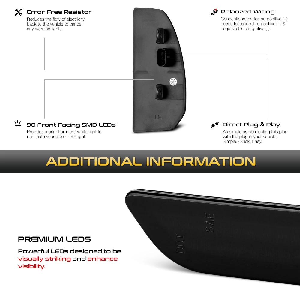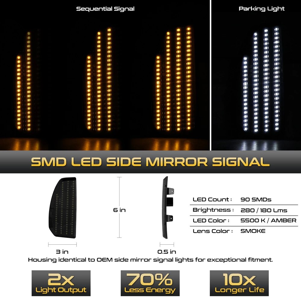 Upgrade your ride with our aftermarket LED side mirror turn signal lights featuring a cutting-edge sequential turn signal function. These high-quality lights not only enhance the appearance of your vehicle but also improve safety on the road.