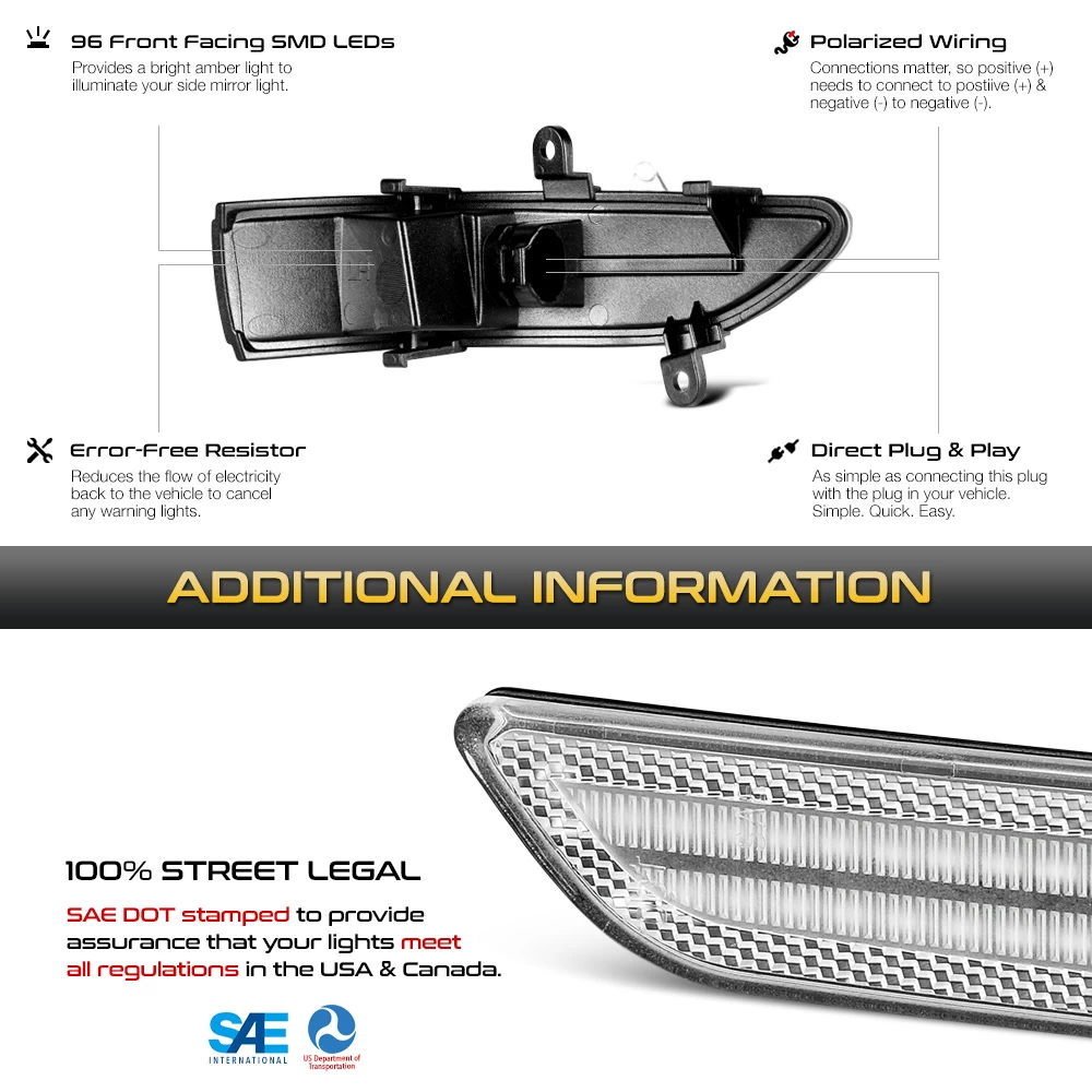 Upgrade your ride with our aftermarket LED side mirror turn signal lights featuring a cutting-edge sequential turn signal function. These high-quality lights not only enhance the appearance of your vehicle but also improve safety on the road.