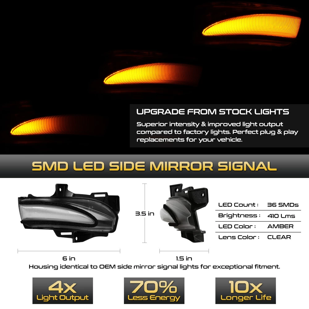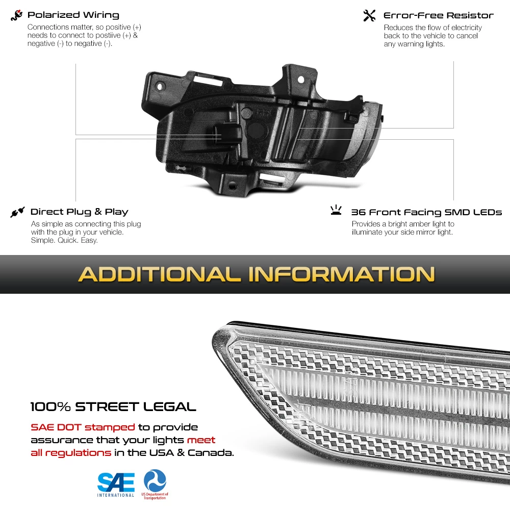 Upgrade your ride with our aftermarket LED side mirror turn signal lights featuring a cutting-edge sequential turn signal function. These high-quality lights not only enhance the appearance of your vehicle but also improve safety on the road.
