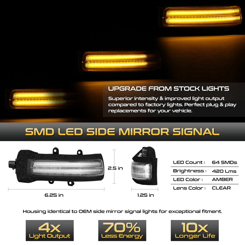 Upgrade your ride with our aftermarket LED side mirror turn signal lights featuring a cutting-edge sequential turn signal function. These high-quality lights not only enhance the appearance of your vehicle but also improve safety on the road.