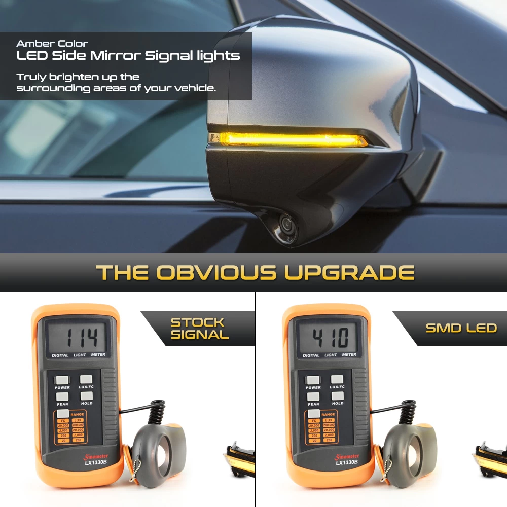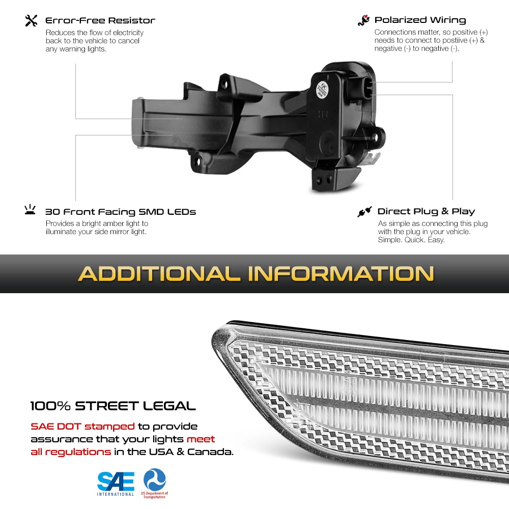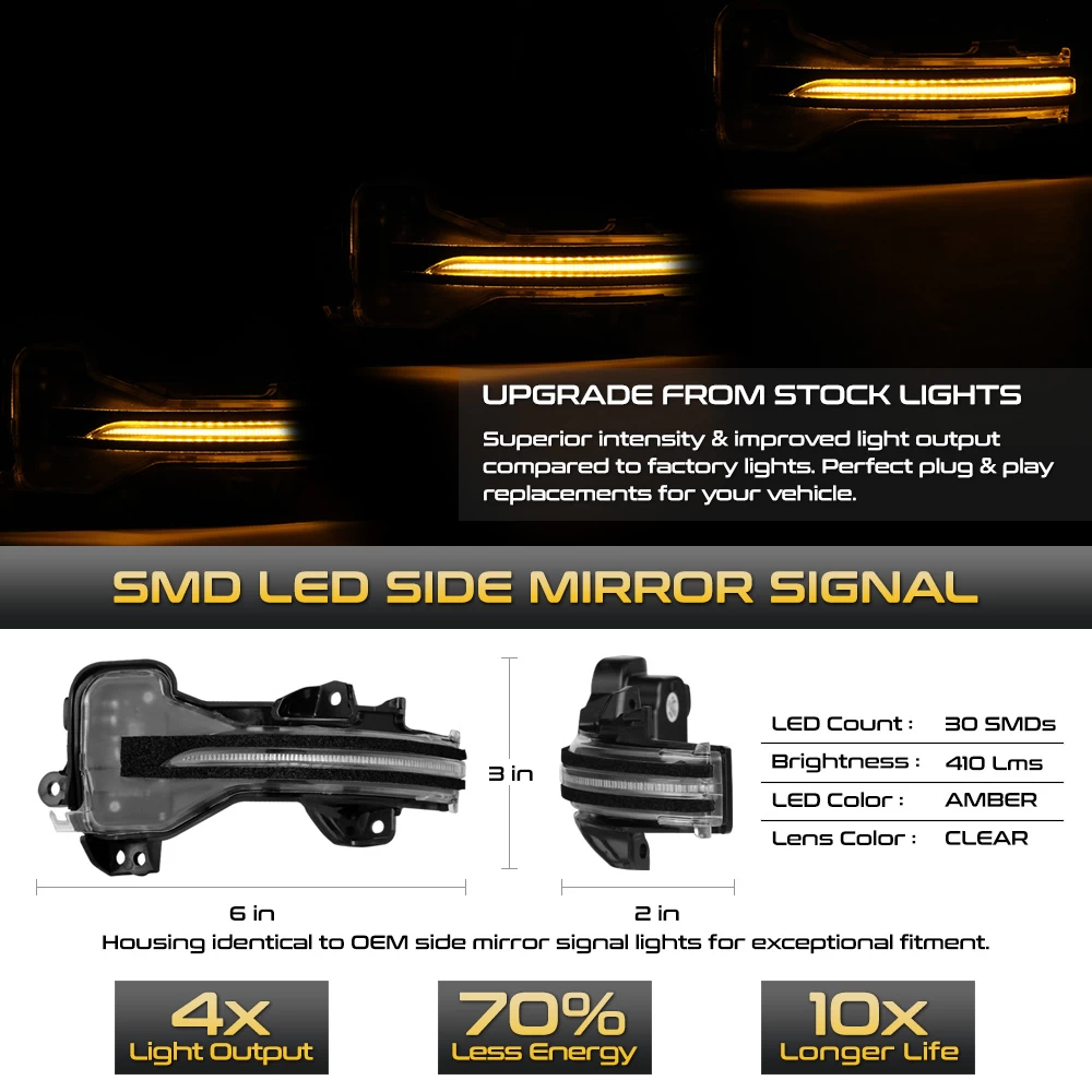 Upgrade your ride with our aftermarket LED side mirror turn signal lights featuring a cutting-edge sequential turn signal function. These high-quality lights not only enhance the appearance of your vehicle but also improve safety on the road.