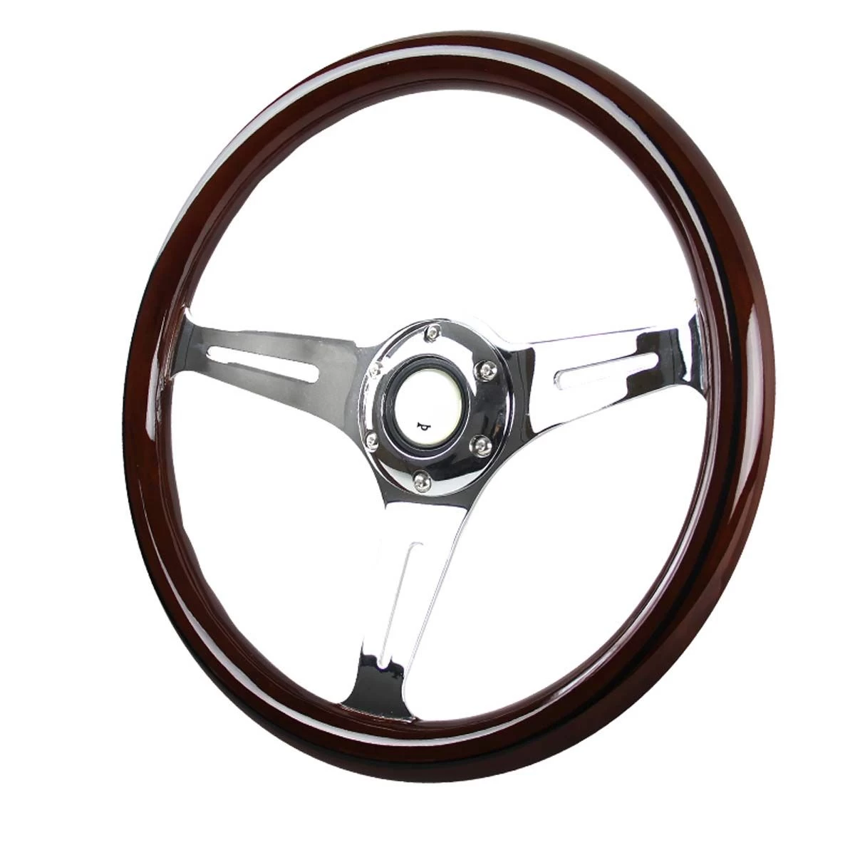 Classic vintage 3-spoke wooden style deep dish steering wheel with black trim.