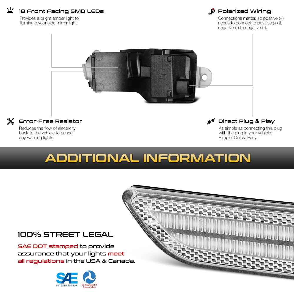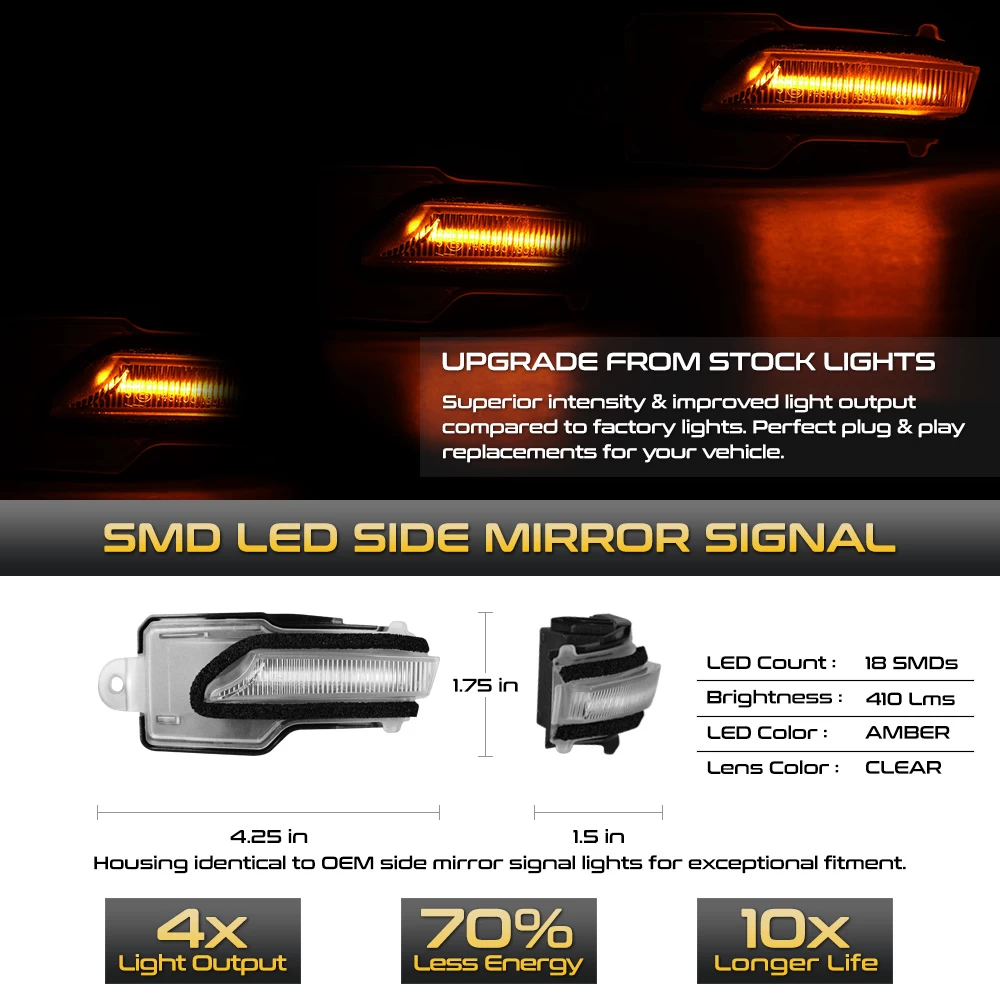 - Direct replacement of factory side mirror turn signal indicator lights