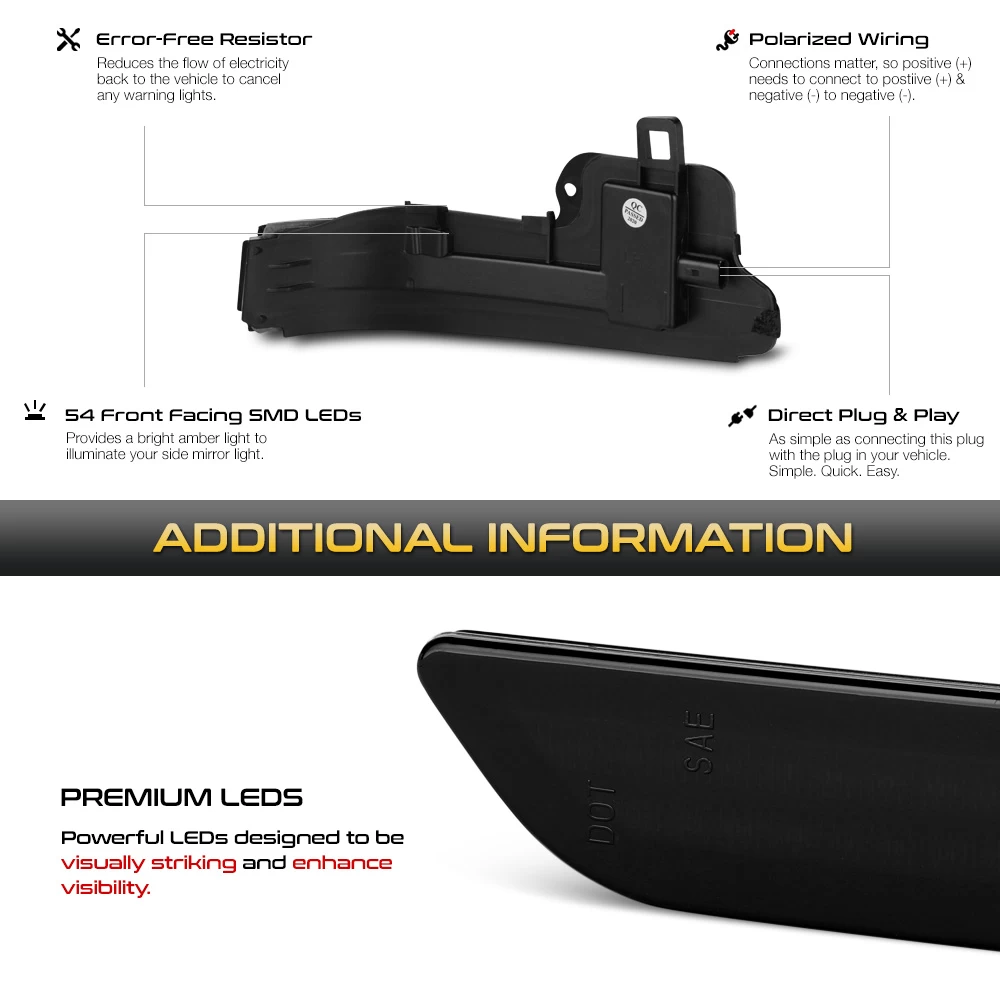 Upgrade your ride with our aftermarket LED side mirror turn signal lights featuring a cutting-edge sequential turn signal function. These high-quality lights not only enhance the appearance of your vehicle but also improve safety on the road.