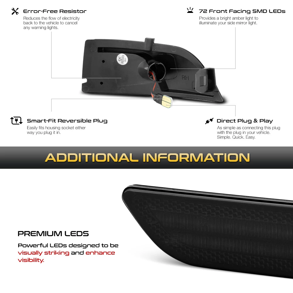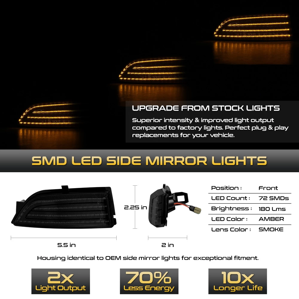 Upgrade your ride with our aftermarket LED side mirror turn signal lights featuring a cutting-edge sequential turn signal function. These high-quality lights not only enhance the appearance of your vehicle but also improve safety on the road.