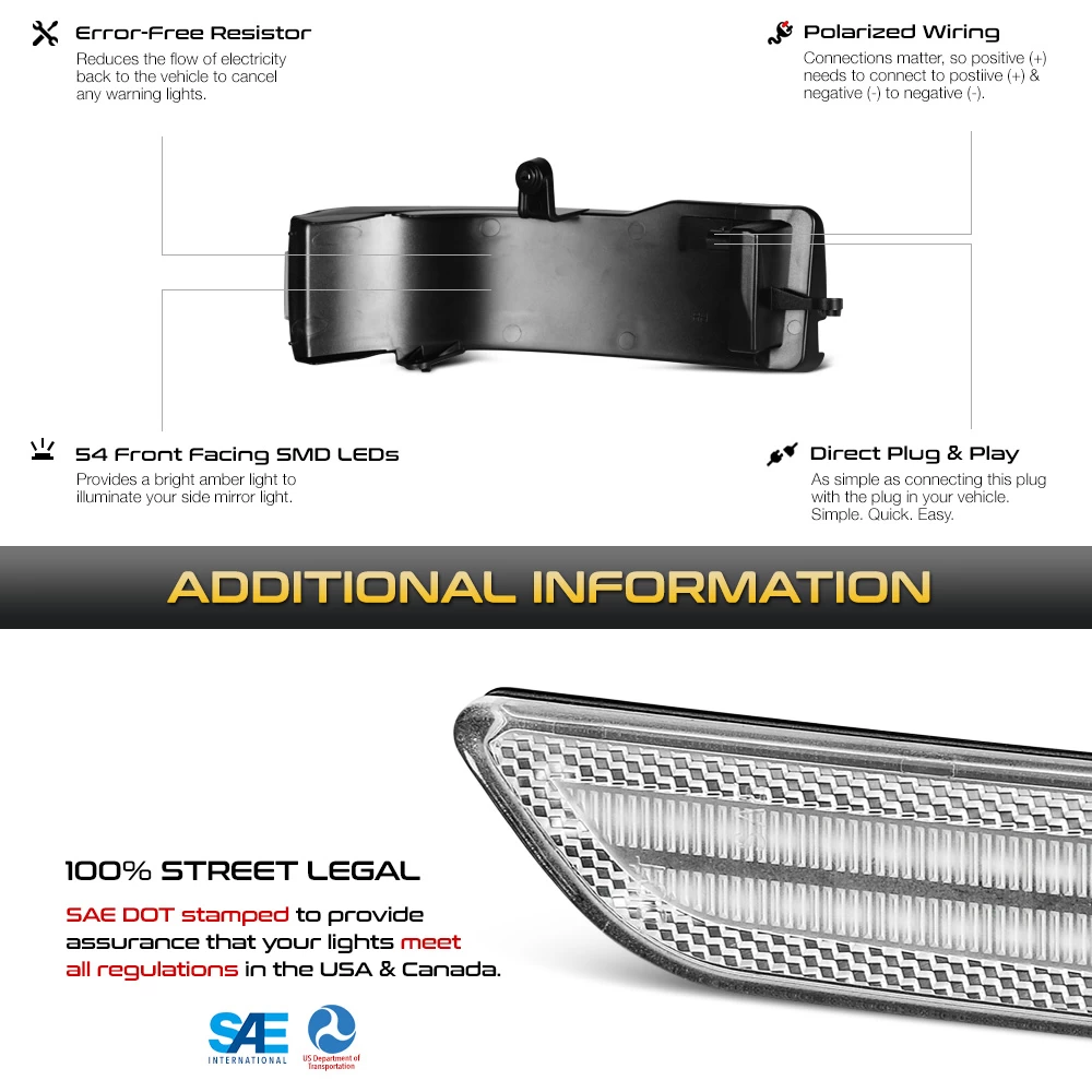 Our LED side mirror turn signal lights offer a sleek and modern design that complements any car or truck. With their sequential turn signal function, these lights provide a dynamic and eye-catching lighting display. As the turn signal is activated, the LEDs light up in a sequential pattern, grabbing attention and alerting other drivers of your intentions.
