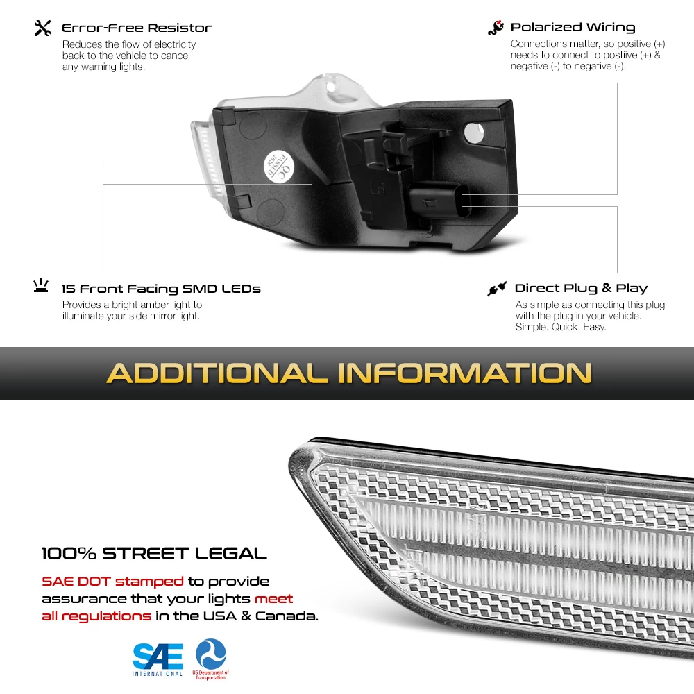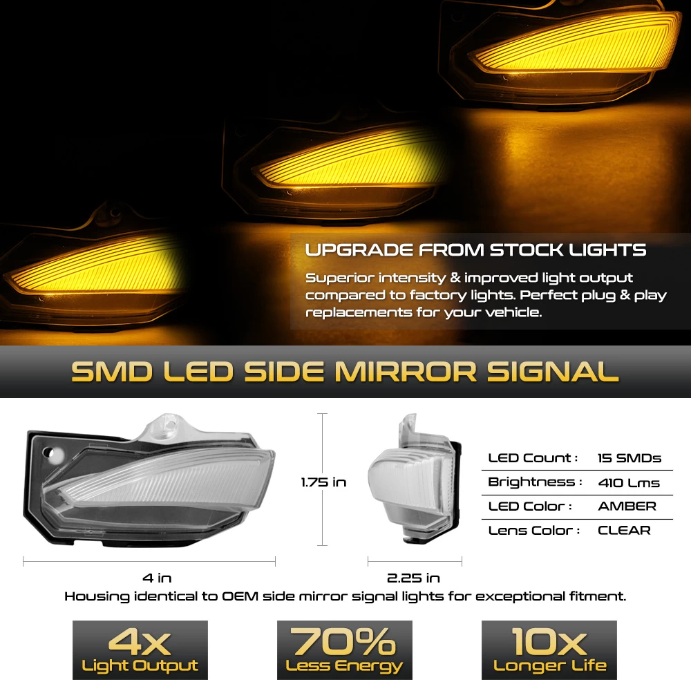 - Direct replacement of factory side mirror turn signal indicator lights