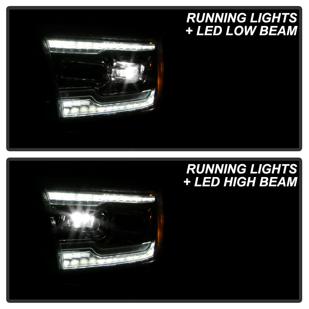 Aftermarket projector headlights for 2019-2021 RAM 1500 Models by Spyder Auto. Spyder apply dual projector for the headlights, which are powered by built-in super-bright LED chip. The cube style LED projector will provide crisp cut-off line and intense light output compare to original headlights. There are upper and bottom LED strip in the headlights in white. The turn signal is sequential activated that are on top of the lower DRL. The headlights also have amber reflector on the side of the headlights. Each headlights are made with polycarbonate plastic lens, which is Anti-Fog treated to prevent yellowing or oxidation.