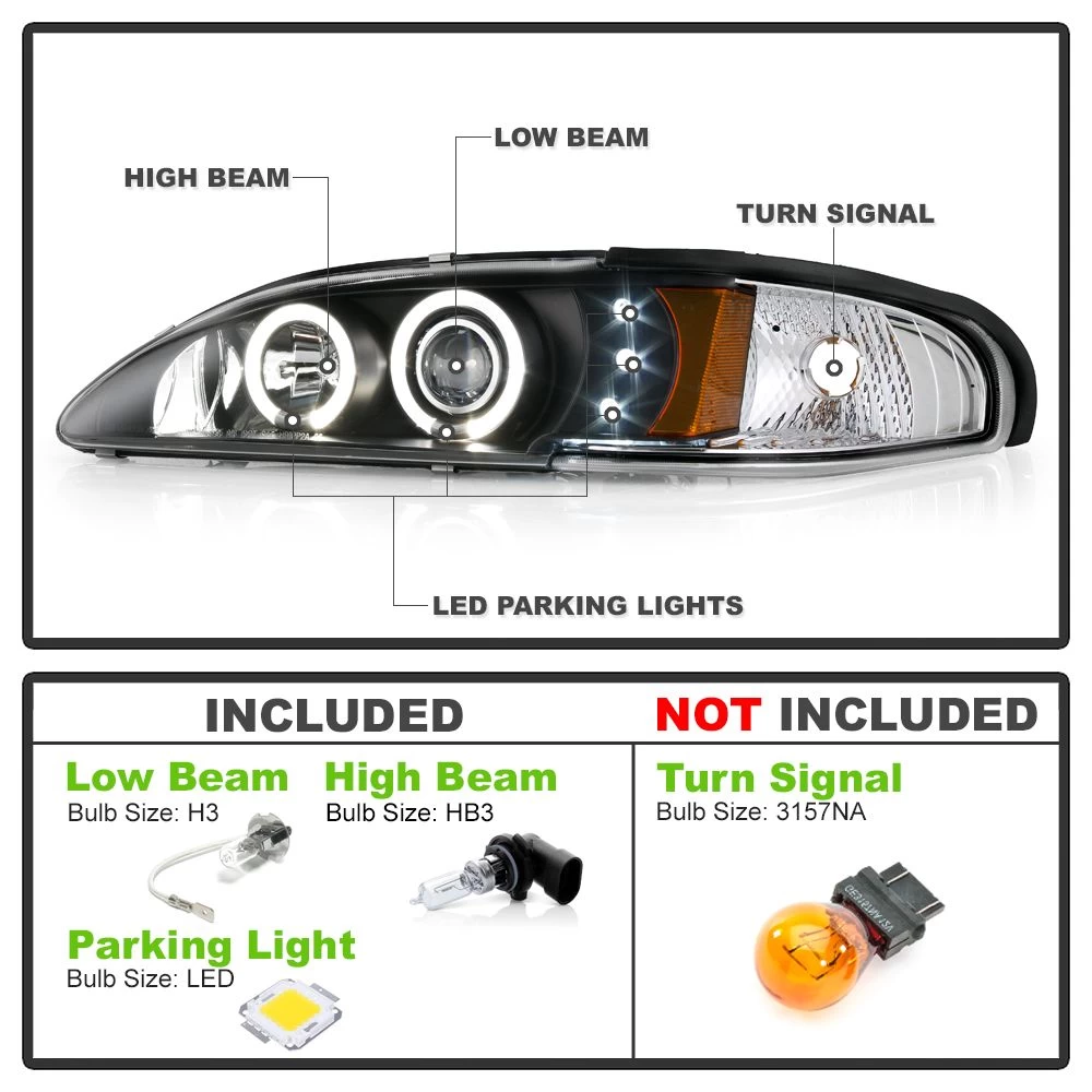 94-98 Ford Mustang Angel Eye Halo & LED Projector Headlights – Black