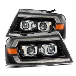 We use dual projectors design for these 11th gen Ford F150 LUXX-series headlights with the LED bar surrounding the projectors as DRL and sequential turn signal. The LED bar also provides an activation light feature which is a running light when you unlock your F150. The outter projector work as low beam, and the inner projector work as high beam. These Ford F150 LUXX-series headlights are with high/low beam projectors that are using LED chips, developed by our own factory.