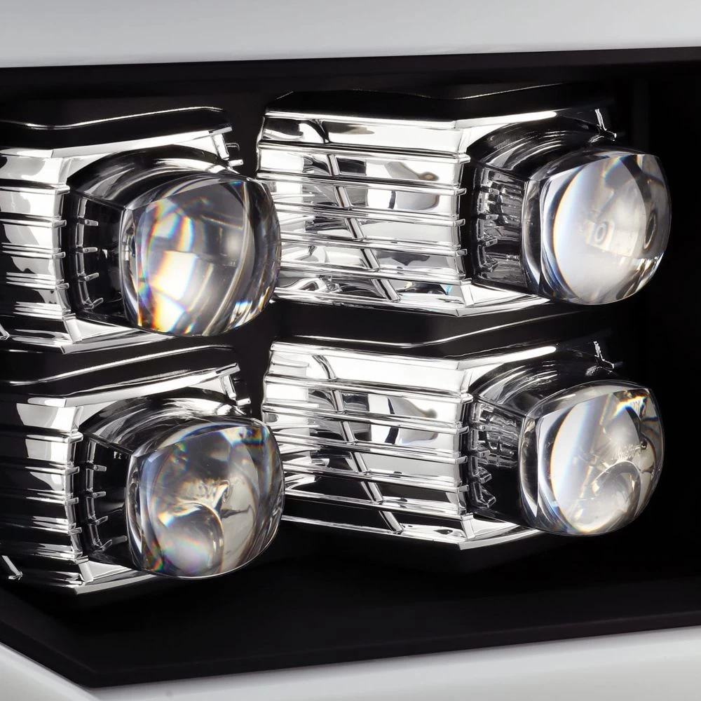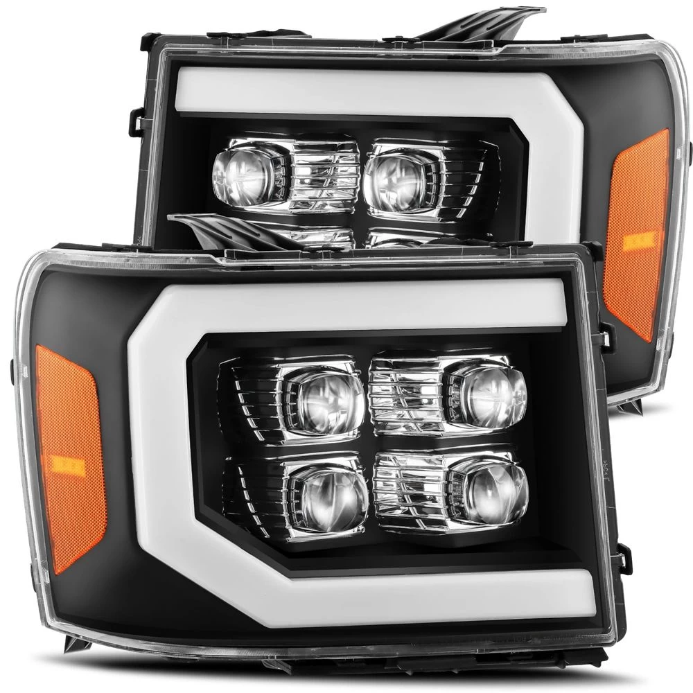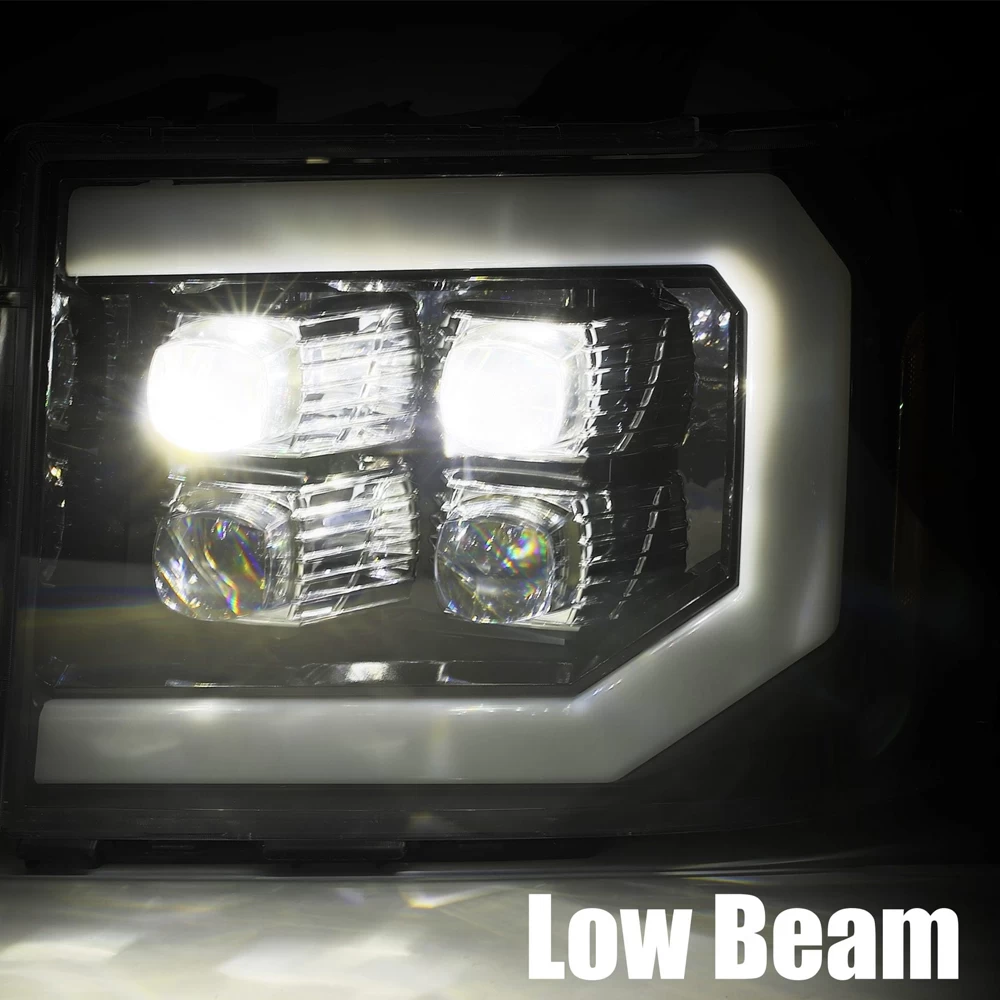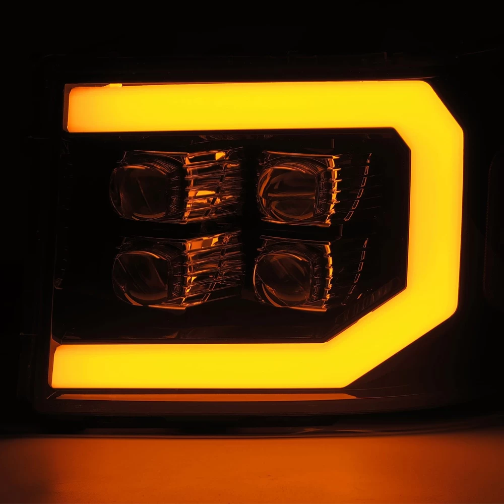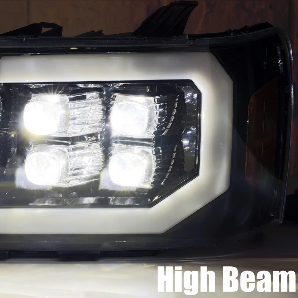 We designed these GMC Sierra NOVA-series projector headlights based on the 2016 generation Sierra trucks for 2007 generation Sierra. We use four of our patented ice-cube 3D projectors for these GMC Sierra NOVA-series projector headlights, and we add a LED light tube surrounding the light. These headlights come with activation light feature, which is a running light when you unlock your Sierra, and with DRL and sequential turn signal light tube. The top two projectors are for low beam and the bottom two projectors are for high beam.