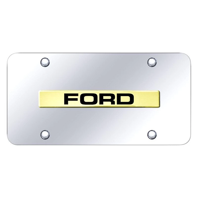 Universal Chrome License Plate with 3D Gold Ford Logo (FOR.N.GC) by Autogold®. Dimensions: 6″ x 12″. Material: Stainless Steel. Add a touch of personalization to your prized investment with this first-grade Autogold license plate that is superior in design and durability. The plate comes with theft-deterrent caps that help keep it from being stolen as well as cover that unsightly hardware creating a sleek, clean look. This product includes vehicle specific hardware to make installation a hassle-free process.