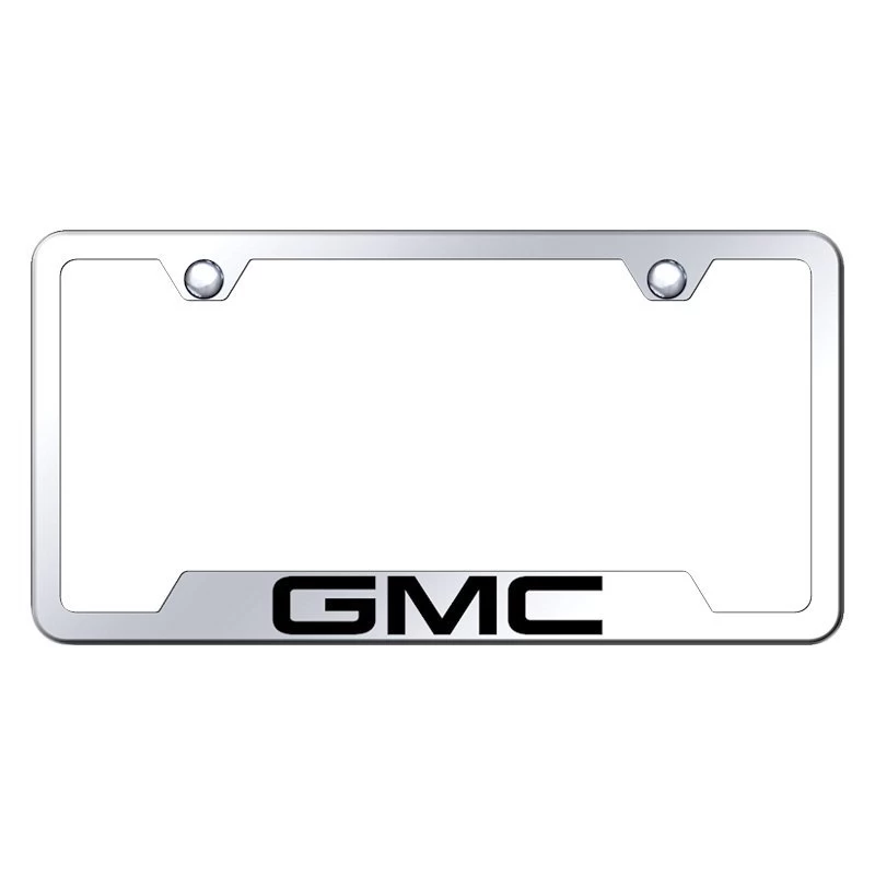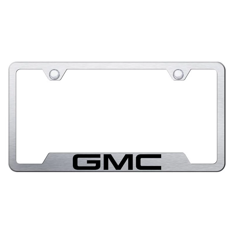 Universal License Plate Frame with Laser Etched GMC Logo by Autogold®. Dimensions: 6.25″ x 12.25″. Material: Stainless Steel. Add a touch of personalization to your prized investment with this first-grade Autogold license plate frame that is superior in design and durability. Crisp laser etched lettering in factory or scripted fonts. Exceptional in both quality and design, these stainless steel license frames are manufactured using the finest materials and workmanship. License frames include vehicle specific hardware and matching theft deterrent caps to conceal unsightly hardware.