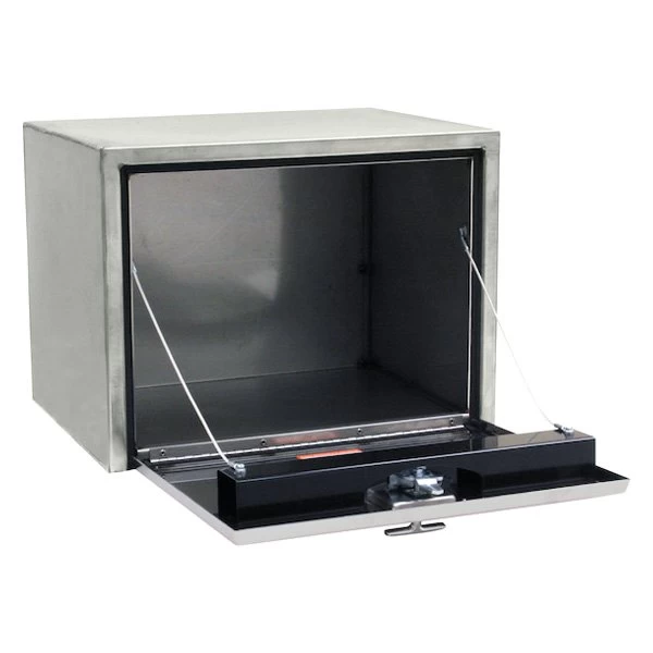 Universal Single Drop Door Underbody Tool Box with Die Cast Compression Latch (1702610) by Buyers®. Dimensions: 48″ Width x 18″ Depth x 18″ Height. Box finish: Plain. Door finish: Polished. Material: Stainless Steel. Number of latches: 2. Protect and easily access your equipment with the Buyers Products Diamond Tread Aluminum Underbody Truck Box. Available in a variety of sizes, each box is made of strong, corrosion-resistant .100 in. thick aluminum. The recessed drop door combined with the continuous hidden hinge and replaceable gasket system keep weather and grime away from your tools. Aircraft grade cables help prevent damage. The locking, die-cast compression latch provides a tight seal and deters theft.