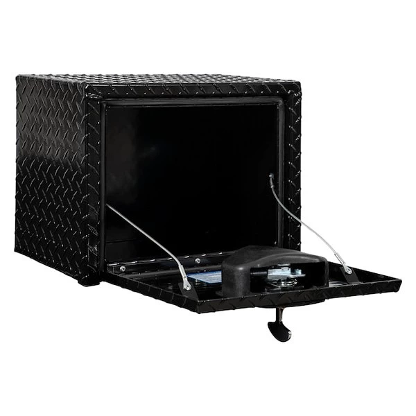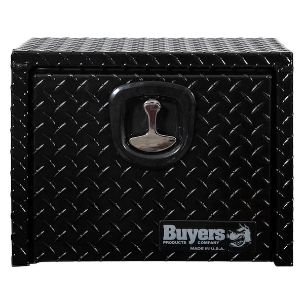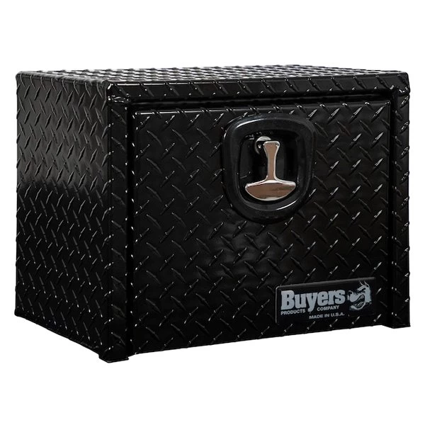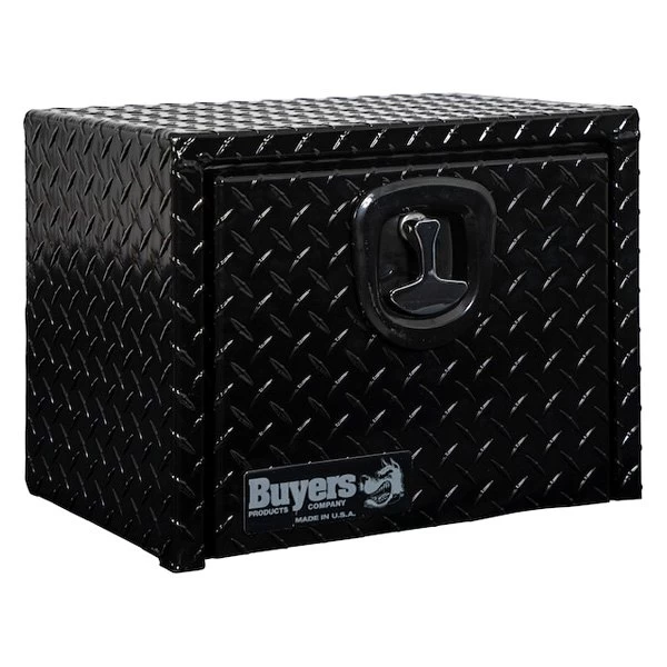 Universal Single Drop Door Underbody Tool Box with Die Cast Compression Latch (1725149) by Buyers®. Dimensions: 18″ Width x 12″ Depth x 14″ Height. Finish: Black Powder Coated. Material: Diamond Tread Aluminum. Number of latches: 1. Protect and easily access your equipment with the Buyers Products Diamond Tread Aluminum Underbody Truck Box. Available in a variety of sizes, each box is made of strong, corrosion-resistant .100 in. thick aluminum. The recessed drop door combined with the continuous hidden hinge and replaceable gasket system keep weather and grime away from your tools. Aircraft grade cables help prevent damage. The locking, die-cast compression latch provides a tight seal and deters theft.