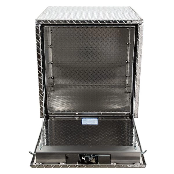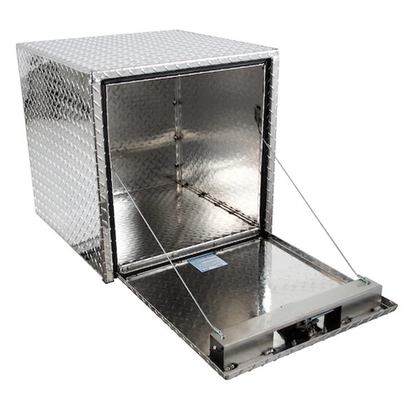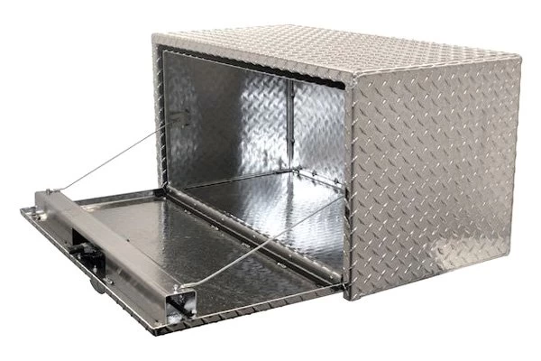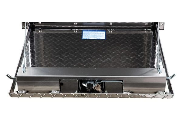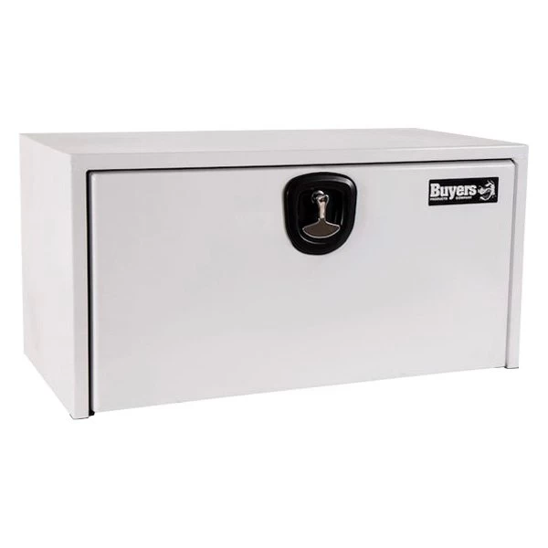 Universal Single Drop Door Underbody Tool Box with 3-Point Compression Latch by Buyers®. Number of latches: 1. Protect and easily access your equipment with the Buyers Products White Steel Underbody Truck Box with 3-Point Latch. Available in a variety of sizes, each professional grade box is made of strong 14 Ga steel with a 12 Ga drop door that can handle the harshest job sites. Then its powder coated white inside and out for superior corrosion resistance and style. The continuous hidden hinge and replaceable gasket system keep weather and grime away from your tools. Aircraft grade cables help prevent damage. The locking, 3-point compression latch provides a tight seal and deters theft.