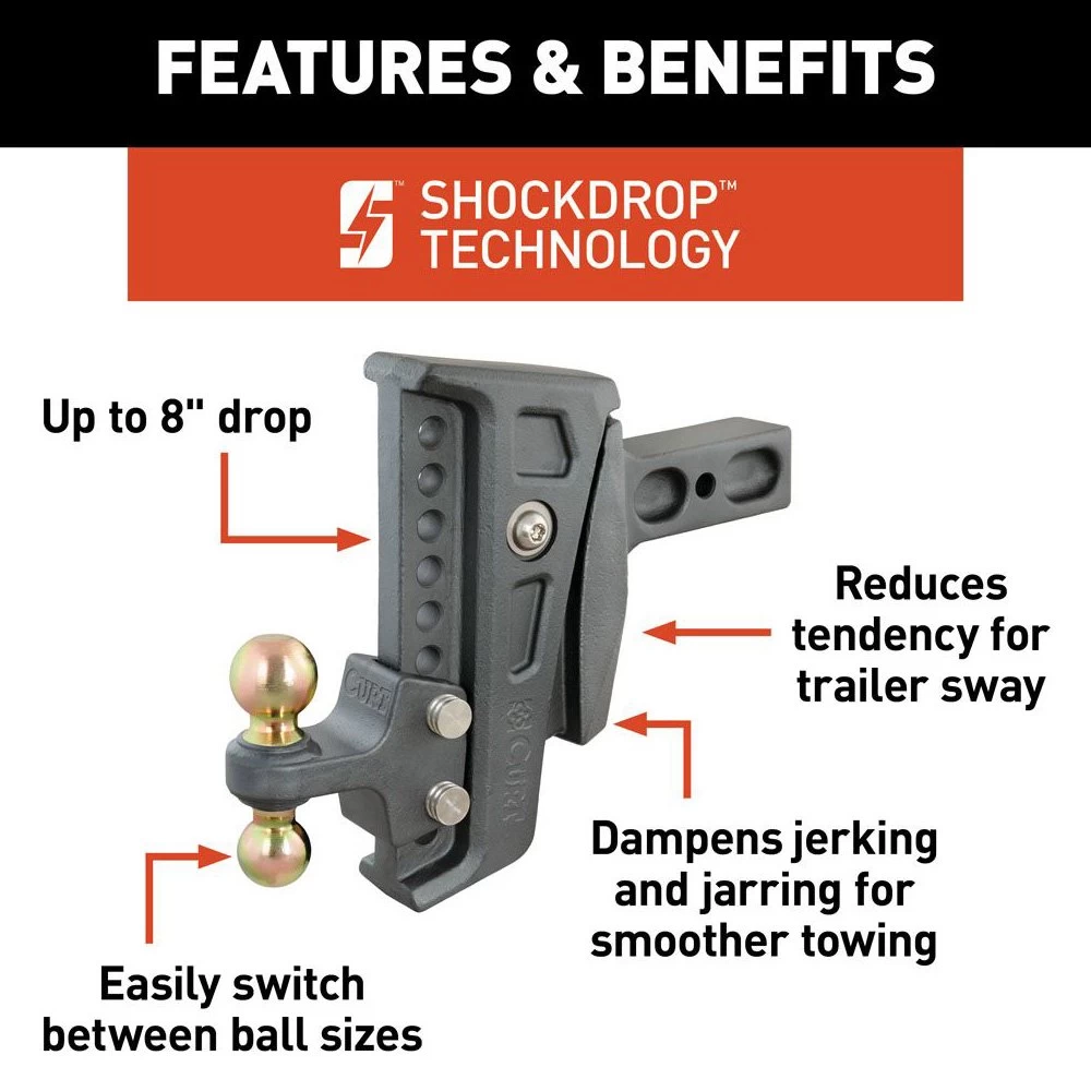 Universal Class 5 Rebellion XD Adjustable Cushion 8″ Drop / 1″ Rise Carbon Steel Ball Mount for 2-1/2″ Receivers (45955) by CURT®. With 2″, 2-5/16″ Ball. Weight Capacity: 20000 lbs GTW / 2000 lbs TW. Pushing the limits of standard towing, CURT forged ball mounts are a powerhouse among receiver-style ball mounts. With solid, one-piece construction, each forged ball mount is designed to surpass other 2″ options to accommodate the added stress of heavy-duty towing. CURT forged ball mounts also come with a thick skin. CURT coat each ball mount in a black carbide powder coat finish to provide superior rust, scratch and UV protection.