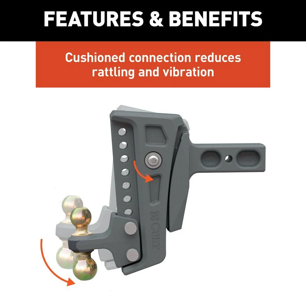 The CURT adjustable trailer hitch mount features an anti-rattle design, promoting a smoother, quieter towing for a more enjoyable ride.