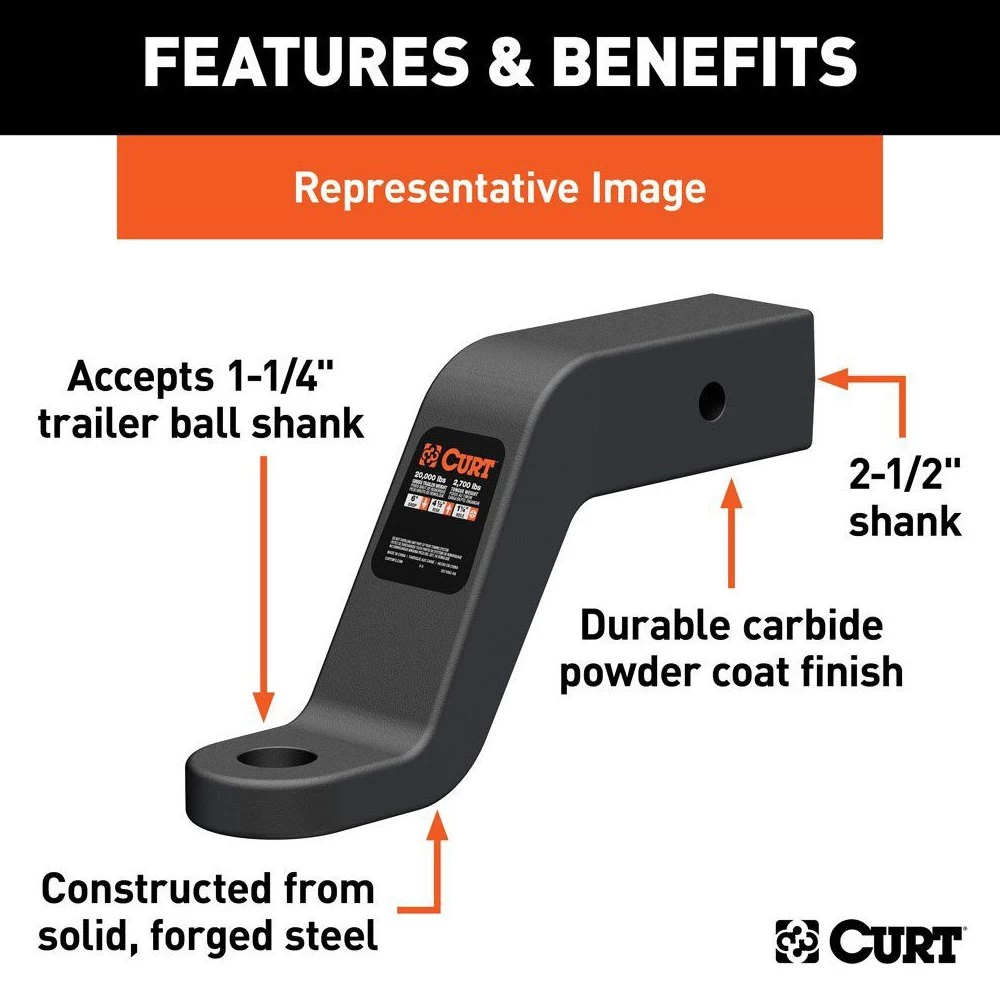 Universal Class 5 Forged Carbide Black Ball Mount for 2-1/2″ Receivers by CURT®. Shank Length: 8-1/2″. Weight Capacity: 20000 lbs GTW / 2700 lbs TW. Ball Hole: 1-1/4″. Pushing the limits of standard towing, CURT forged ball mounts are a powerhouse among receiver-style ball mounts. With solid, one-piece construction, each forged ball mount is designed to surpass other 2″ options to accommodate the added stress of heavy-duty towing. CURT forged ball mounts also come with a thick skin. CURT coat each ball mount in a black carbide powder coat finish to provide superior rust, scratch and UV protection.