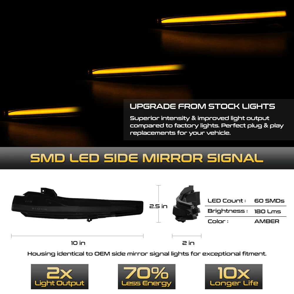 Upgrade your ride with our aftermarket LED side mirror turn signal lights featuring a cutting-edge sequential turn signal function. These high-quality lights not only enhance the appearance of your vehicle but also improve safety on the road.