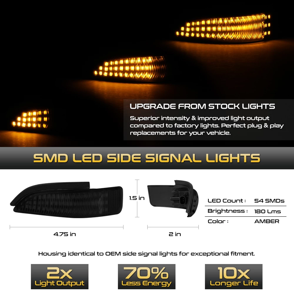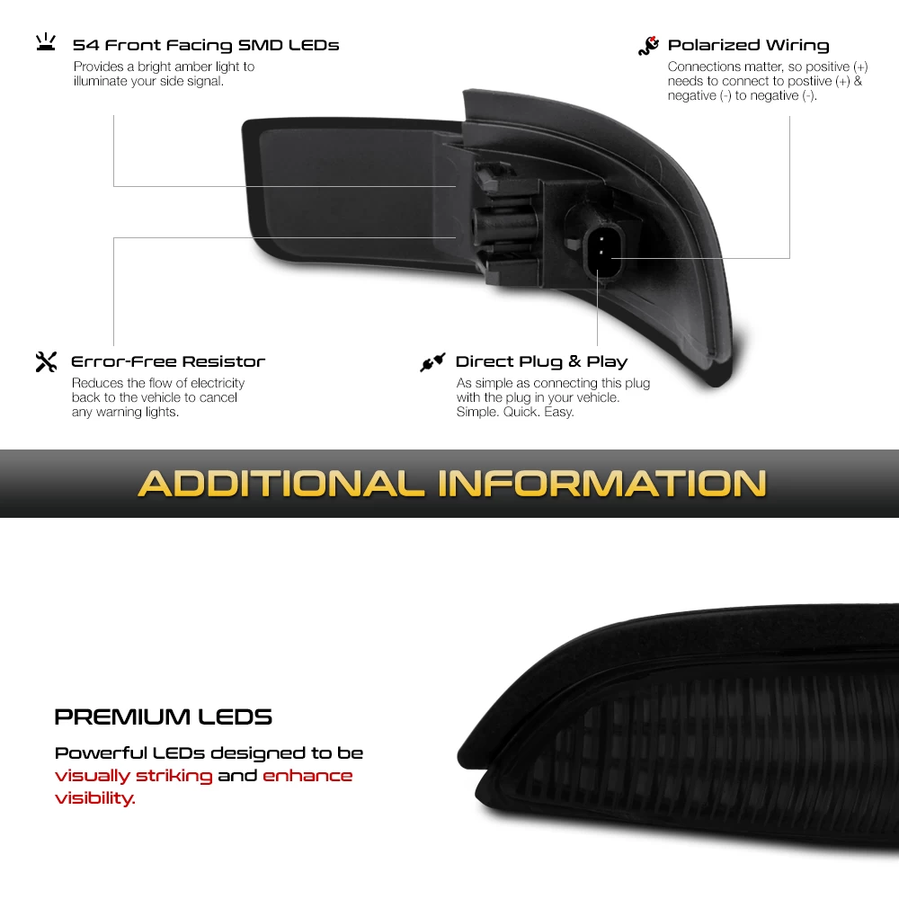 Upgrade your ride with our aftermarket LED side mirror turn signal lights featuring a cutting-edge sequential turn signal function. These high-quality lights not only enhance the appearance of your vehicle but also improve safety on the road.
