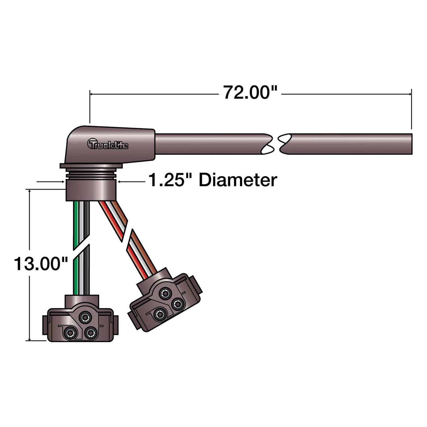 Universal 50 Series 72″ Driver Side 2 Plug Stop/Turn/Tail Wiring Harness with Stop/Turn/Tail Breakout (50201) by Truck-Lite®. 14 Gauge. Right Angle PL-3, Ring Terminal. This product is made from high-grade materials to meet the strictest standards of high quality. Designed with the utmost care and attention to detail, this Truck-Lite product ensures superior reliability. It provides long lasting and trouble-free service life This top-grade product is expertly made in compliance with stringent industry standards to offer a fusion of a well-balanced design and high level of craftsmanship. Manufactured from industry-leading materials using up-to-date equipment, it ensures everlasting reliability and enduring value. This product is distinguished by total quality assurance, unsurpassed by anybody else.